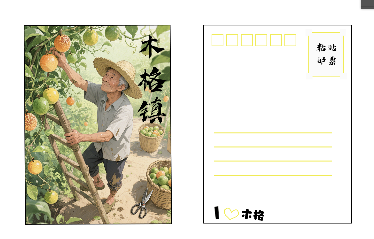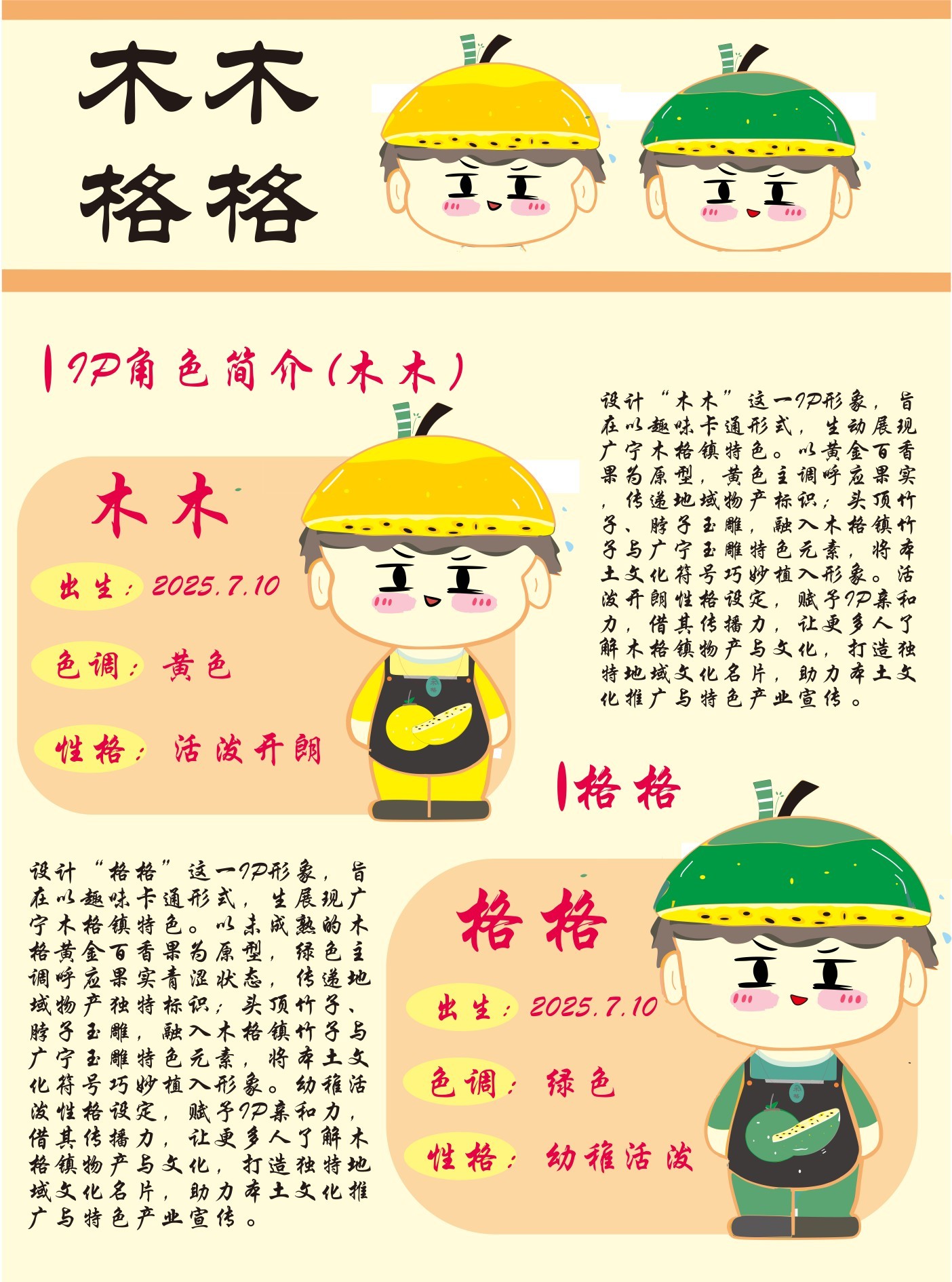 在木格镇的实践里,基于前期调研,智芯筑梦突击队充分发挥专业优势,以文创为乡村产业注入新活力。队员们深入调研后,精心设计出“木木”“格格”2个极具地域特色的IP形象,他们承载着木格镇的乡土情怀与百香果的黄金品质。同时制作了4款独具匠心的百香果包装盒(巧妙融入广宁竹编元素)、2款趣味实用的贴纸和1款展现木格风情的精美明信片。